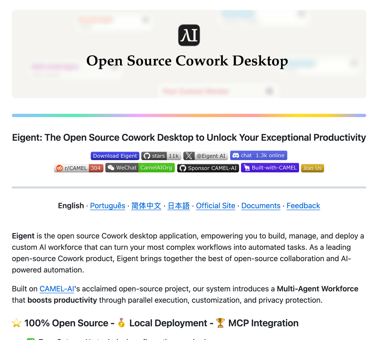 eigent-ai/eigent 대상 사용자: AI/ML 엔지니어 💡 eigent-ai/eigent 저장소 정보 언어: TypeScript 스타: 11,155 포크: 1,255 최근 스타: +3,739