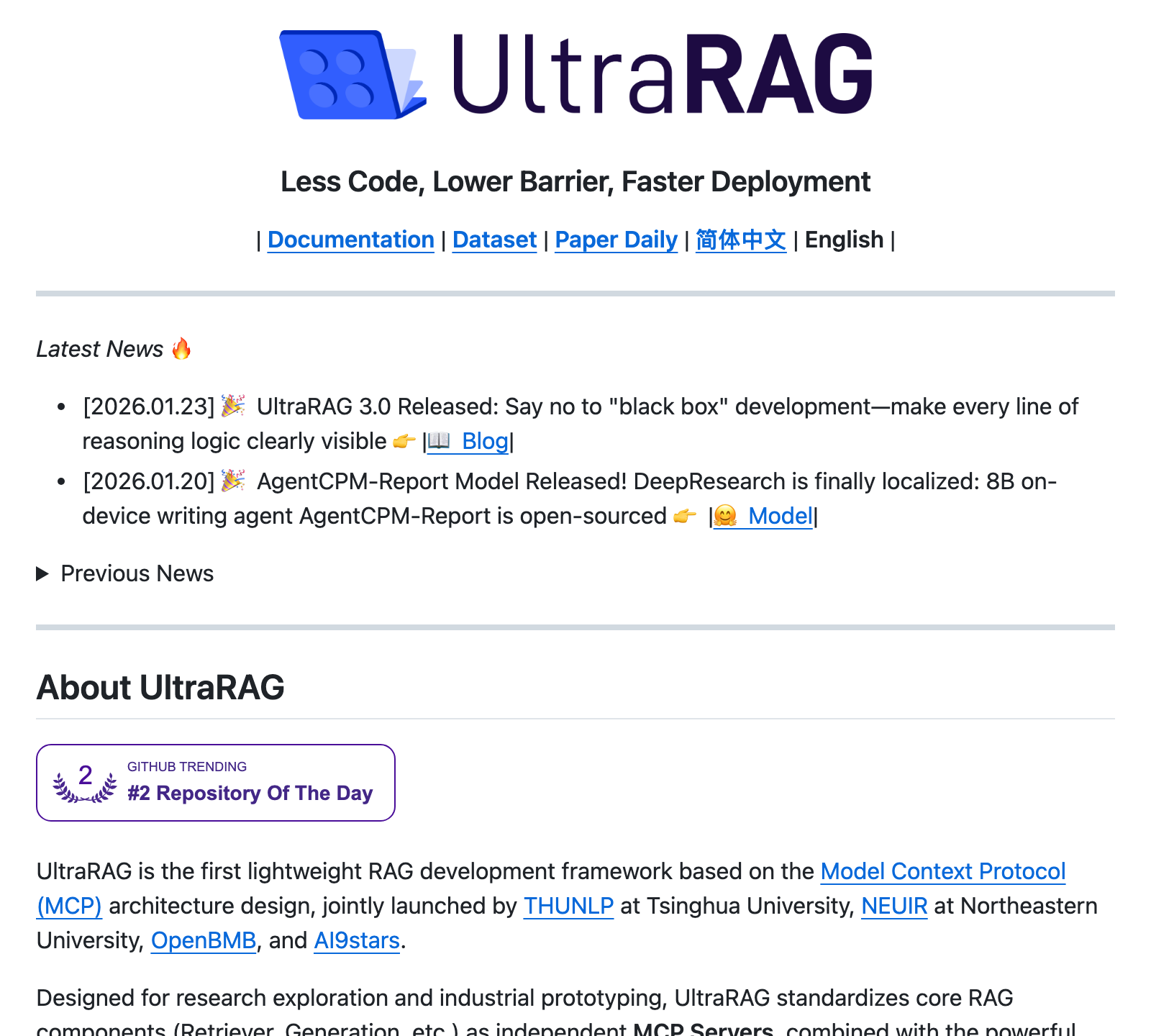 OpenBMB/UltraRAG 대상 사용자: AI/ML 엔지니어 💡 OpenBMB/UltraRAG 저장소 정보 언어: Python 스타: 3,296 포크: 247 최근 스타: +803